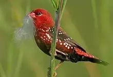 红梅花雀小型鸟类,体长9-10厘米。雄鸟通体朱红色,背、肩、胸等满布白色小斑点,两翅和尾黑褐色均具白色端斑,嘴红色,脚蜡黄色。雌鸟上体淡褐色或赭褐色,翅上中覆羽、大覆羽和内侧飞羽末端具白色斑点,…全部>>