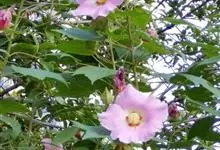 海滨木槿是锦葵科木槿属植物,落叶小乔木,株高3-5米,胸径20厘米,扁球形树冠,枝叶繁盛。厚纸质单叶互生,扁圆形、倒卵形或宽倒卵形,先端钝近平,具短突尖,基部圆形或浅心形,叶缘中上部具细圆齿,…全部>>