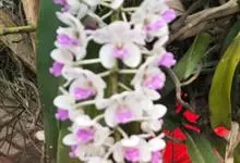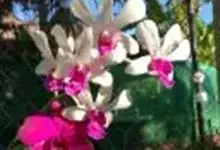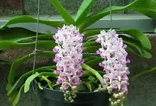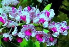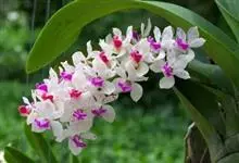 指甲兰是兰科指甲兰属植物。其茎粗壮;叶带状;总状花序疏生数朵花;萼片和花瓣淡白色,上部具紫红色;唇瓣侧裂片镰状长圆形;中裂片近宽卵形,前半部紫色,后半部白色带紫色斑点和条纹,先端凹缺,…全部>>