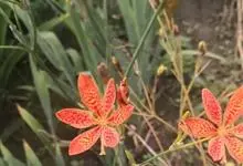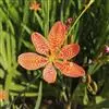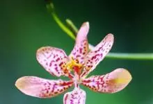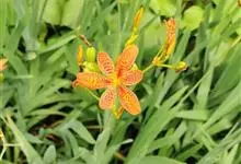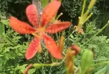射干 Redouté)是鸢尾科射干属多年生草本植物。根状茎为不规则的块状,斜黄色或黄褐色;花橙红色,散生紫褐色的斑点;花药呈条形;子房下位,倒卵形;蒴果倒卵形或长椭圆形;种子圆球形,黑紫色,有光泽。…全部>>