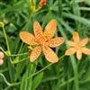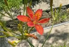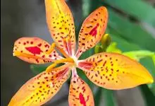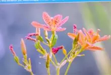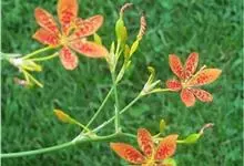 射干 Redouté)是鸢尾科射干属多年生草本植物。根状茎为不规则的块状,斜黄色或黄褐色;花橙红色,散生紫褐色的斑点;花药呈条形;子房下位,倒卵形;蒴果倒卵形或长椭圆形;种子圆球形,黑紫色,有光泽。…全部>>