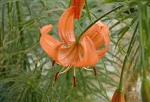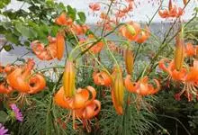 东北百合,别名卷莲花、老哇芋头、轮叶百合、伞蛋花、山丹花,为百合科、百合属多年生球根花卉。鳞茎卵圆形,白色,有节。苞片叶状,花淡橙红色,具紫红色斑点;花被片稍反卷,蒴果倒卵形,花期7-8月,果期9月,…全部>>
