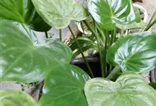 海芋 K. Koch),是天南星科海芋属的大型常绿草本植物;具匍匐根茎,有直立地上茎,基部生不定芽条;叶多数,亚革质,草绿色,箭状卵形,叶柄绿或污紫色,螺旋状排列,粗厚;花序梗圆柱形,绿色,有时污紫色,…全部>>