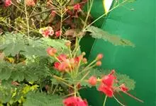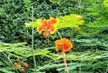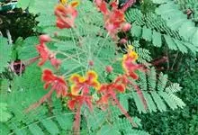 洋金凤 Sw.),豆科小凤花属灌木状或小乔木植物,枝无毛,绿或粉绿色;二回羽状复叶;总状花序伞房状,萼片无毛,花瓣橙红或黄色,圆形,花丝红色,子房无毛,花柱橙黄色;荚果窄而薄,…全部>>