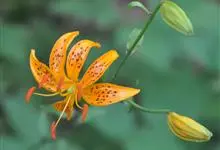 东北百合,别名卷莲花、老哇芋头、轮叶百合、伞蛋花、山丹花,为百合科、百合属多年生球根花卉。鳞茎卵圆形,白色,有节。苞片叶状,花淡橙红色,具紫红色斑点;花被片稍反卷,蒴果倒卵形,花期7-8月,果期9月,…全部>>