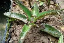 棒叶落地生根是景天科、落地生根属植物。茎直立、粉褐色。叶圆棒形,上表面有沟、粉色,有红褐斑。叶片交互对生,交叉排列成十字形。叶端锯齿上长有很小的幼株、落地后即可生根成活。原产非洲马达加斯加。…全部>>