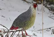 血雉雉科血雉属鸟类,别名血鸡、松花鸡,血雉的雄鸟大覆羽、尾下覆羽、尾上覆羽、脚、头侧、腊膜为红色,故称血雉。其别名甚多,各地皆异。在甘肃,因其胸侧和翅上覆羽沾绿,被称为“绿鸡”;因其羽毛形似柳叶,…全部>>