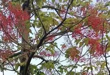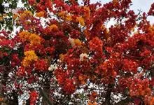 凤凰木 Raf.) ,别名火树、红花楹、凤凰花、火凤凰、金凤花、红楹,是豆科凤凰木属高大落叶乔木,树皮灰褐色,粗糙。二回偶数羽状复叶互生,矩圆形,两面均被柔毛。伞房式总状花序,花大,花瓣5枚,圆形,…全部>>