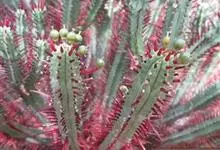 红彩云阁是彩云阁的栽培品种。原种彩云阁产于纳米比亚,其形态为多分枝灌木,分枝全部向上生长。3—4棱,通常3棱,粗4—6厘米、长15—25厘米,但在栽培中分枝较细而更长。棱缘有坚硬短齿。表皮深绿色有白…全部>>