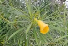 黄花夹竹桃K. Schum.),又名“酒杯花”“柳木子”“黄花状元竹”,是夹竹桃科,黄花夹竹桃属下的常绿乔木植物。高达5m,全株无毛,树皮棕褐色;叶互生,近革质,线形或线状披针形;花大,黄色,具香味,…全部>>