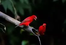普通朱雀是雀形目雀科朱雀属鸟类,又名红朱雀、马料、青麻料。雄鸟上体红色,下体淡红色;头部、喉部、胸部及腰部亮红色;背部褐色染红色;两翼及尾黑褐色,羽缘染红色。雌鸟上体橄榄褐色,下体近白色,…全部>>
