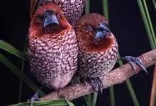 栗腹文鸟:小型鸟类,体长10-12厘米。嘴蓝灰色,基部粗厚,先端尖、呈圆锥状, 脚亦为蓝灰色,整个头、颈和上胸黑色,其余体羽栗色,或下胸和腹中央至尾下覆羽黑色。尾栗红色。全部>>
