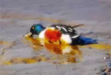 琵嘴鸭:属中型鸭类,个体比绿头鸭稍小,体长43-51厘米,体重0.5千克左右。雄鸭头至上颈暗绿色而具光泽,背黑色,背的两边以及外侧肩羽和胸白色,且连成一体,翼镜金属绿色,腹和两胁栗色,脚橙红色,嘴黑色,…全部>>