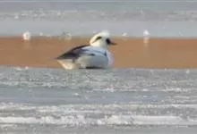 斑头秋沙鸭,是鸭科、斑头秋沙鸭属鸟类。雄鸟眼先和眼周黑色,成块斑状;头部其余部分全为白色。颈白色;背黑色,上背最前处的白羽具有黑端,相连而成两条半圆环狭带。下体白色,体侧羽毛具黑褐色波状细纹。…全部>>