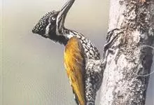 三趾啄木鸟,是啄木鸟科、啄木鸟属的小型鸟类,体长20-23厘米,雄鸟头顶金黄色,雌鸟黑色而具白色斑点。眼至耳覆羽黑色,眼后有一条白色纵纹,颊纹白色,颚纹黑色,甚为醒目。枕和后颈黑色,…全部>>