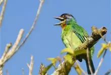 绿拟啄木鸟为鴷形目,须科,拟啄木属的一种。形较大拟啄木鸟略小,体长约260mm。头、颈及胸浅褐而具淡黄白色条纹;喉几为淡黄白色;身体余部草绿色。虹膜棕褐色,眼周裸露部黄色;嘴峰角黄色;跗跖和趾角黄…全部>>