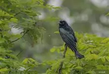 发冠卷尾是中型鸟类,体长28-35厘米。通体绒黑色缀蓝绿色金属光泽,额部具发丝状羽冠,外侧尾羽末端向上卷曲。栖息于海拔1500米以下的低山丘陵和山脚沟谷地带,多在常绿阔叶林、次生林或人工松林中活动。…全部>>