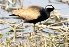 铜翅水雉雉鸻科铜翅水雉属的一种物种,是小型涉禽,体长28-31厘米。头颈、下体黑色,具金属色辉。从眼到颈有白色纵纹,背、内侧初级一飞羽橄榄铜绿色,尾下覆羽栗色。跗蹠的前后均有盾状鳞,趾、爪均甚长,…全部>>