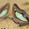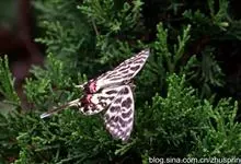 大二尾蛱蝶两翅正面黑色,中域有一浅绿色大型宽带纹,两翅反面浅绿色,中域有一缀黑边的褐色弧纹,亚外缘还有一深褐色横纹,后翅各有尾突两条,…全部>>