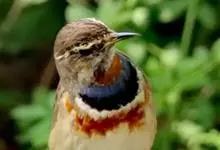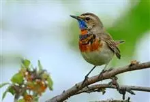蓝点颏亦称“蓝喉歌鸲”,通称蓝靛颏儿。身体大小和麻雀相似,体长12-13厘米,体重17-18克。头部、上体主要为土褐色。眉纹白色。尾羽黑褐色,基部栗红色。颏部、喉部辉蓝色,下面有黑色横纹。下体白色。…全部>>