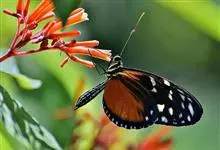 黑脉金斑蝶:翅阔8.6-12.4厘米。雄蝶较雌蝶为大。成年蝶颜色鲜艳,翅膀上有显眼的橙色及黑色斑纹,周围是宽阔的黑色边框,布有许多白色斑点。这种引人注目的着色是对捕食者的视觉警告,表示这个物种有毒;…全部>>