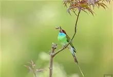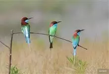 栗喉蜂虎是蜂虎科蜂虎属的鸟类。有热带鸟类羽毛艳丽的特征:喉部是栗红色的,黑色的过眼纹,翅膀和背部是绿色的,尾翼是蓝色的,飞行时翅膀下面的羽毛是橙黄色的,在阳光的照射下,它们全身闪烁着金属般的艳丽光泽,…全部>>