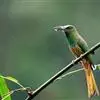 蓝喉蜂虎中型鸟类,体长26~28厘米。头顶至上背栗红色或巧克力色,过眼线黑色,腰和尾蓝色,翼蓝绿色,腰及长尾浅蓝,中央尾羽延长成针状,明显突出于外。颏喉蓝色,其余下体和两翅绿色。嘴细长而尖,黑色,…全部>>