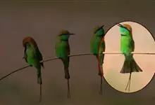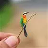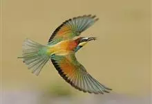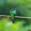 栗喉蜂虎是蜂虎科蜂虎属的鸟类。有热带鸟类羽毛艳丽的特征:喉部是栗红色的,黑色的过眼纹,翅膀和背部是绿色的,尾翼是蓝色的,飞行时翅膀下面的羽毛是橙黄色的,在阳光的照射下,它们全身闪烁着金属般的艳丽光泽,…全部>>