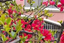 贴梗海棠Nakai)是蔷薇科、木瓜海棠属植物。落叶灌木,高达2米,枝条直立开展,有刺。叶片卵形至椭圆形,稀长椭圆形,长3-9厘米,宽1.5-5厘米。花先叶开放,3-5朵簇生于二年生老枝上。…全部>>