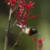 黑胸太阳鸟:小型鸟类,体长9-15厘米。嘴细长而向下曲。雄鸟中央尾羽特长,尾呈楔形,头顶至后颈紫蓝色具金属光泽;背褐红色,腰有一黄色横带,尾上覆羽和尾紫蓝色;颏、喉和上胸乌黑色,有的下胸为硫黄色,…全部>>