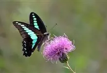 青带凤蝶Graphium sarpedon ,又名青凤蝶,是最普遍的中型凤蝶,飞行速度很快。青带凤蝶的翅膀中央有许多浅蓝色的斑点,很整齐地排列成一条直线。这些斑点由上而下逐渐变大,就像一条青色的带子。全部>>