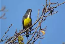 黄腹啄花鸟:体重11-16克,体长104-117毫米。是一种体型大,下腹部为艳黄色的啄花鸟,雄鸟特征为头黑色,喉部有白色纵斑、喉侧及上体成对比,两翅和尾黑色,外侧尾羽内翈具白色斑块。其余下体淡黄色。…全部>>