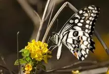 无尾凤蝶,Papilio demoleus ,鳞翅目凤蝶科凤蝶属的一个物种。展翅宽70~80mm。翅膀黑色,具不规则的米黄色斑;下翅有明显橙色斑,无尾状突起,无近似种。春至初夏最多,…全部>>