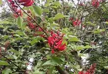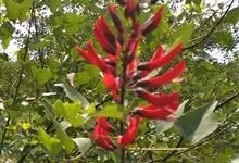 龙牙花是豆科刺桐属小乔木或灌木植物。株高可达3-5米;树干和分枝有散生皮刺;羽状复叶具3小叶,叶柄无毛,有时有下弯的刺,小叶菱状卵形,先端渐尖而钝或长渐尖,基部宽楔形,两面无毛,…全部>>