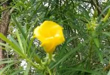 黄花夹竹桃K. Schum.),又名“酒杯花”“柳木子”“黄花状元竹”,是夹竹桃科,黄花夹竹桃属下的常绿乔木植物。高达5m,全株无毛,树皮棕褐色;叶互生,近革质,线形或线状披针形;花大,黄色,具香味,…全部>>