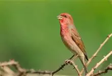 普通朱雀是雀形目雀科朱雀属鸟类,又名红朱雀、马料、青麻料。雄鸟上体红色,下体淡红色;头部、喉部、胸部及腰部亮红色;背部褐色染红色;两翼及尾黑褐色,羽缘染红色。雌鸟上体橄榄褐色,下体近白色,…全部>>