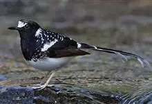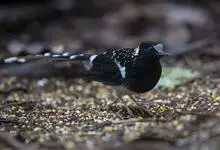 斑背燕尾是鹟科、燕尾属中型鸟类,体长24-25厘米。额至头顶前部白色,其余头、颏、喉、胸黑色,后颈有一白领,背黑色具圆形白色斑点,腰白色,两翅黑色具白色翅斑,尾呈深叉状,黑色、具白色端斑。…全部>>