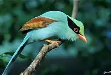 蓝绿鹊:中型鸟类,共有5个亚种。体长36-38厘米。尾长,嘴、脚红色。通体羽色主要为草绿色,宽阔的黑色贯眼纹向后延伸到后颈,在绿色的头侧极为醒目。两翅栗红色,内侧飞羽具黑色次端斑和白色尖端。尾绿色,…全部>>