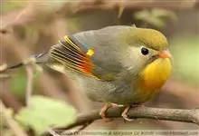 银耳相思鸟小型鸟类,体长14~18厘米。头顶黑色,耳羽银灰色,前额橙黄色;外侧飞羽橙黄色,基部朱红色,极为鲜艳、醒目。尾圆形,尾上、尾下覆羽朱红色,尾暗灰褐色,外侧尾羽橙黄色,其余上体橄榄绿或橄榄黄色。…全部>>