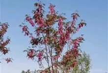 红花刺槐是豆科刺槐属的植物。其干皮深纵裂;枝具托叶刺,羽状复叶互生,叶片卵形或长圆形,具芒尖;基部圆形。花两性;总花序下垂;花冠粉红色,芳香;果条状长圆形,腹缝有窄翅。花期4~5月,果期9~10月。…全部>>
