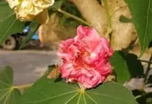 海滨木槿是锦葵科木槿属植物,落叶小乔木,株高3-5米,胸径20厘米,扁球形树冠,枝叶繁盛。厚纸质单叶互生,扁圆形、倒卵形或宽倒卵形,先端钝近平,具短突尖,基部圆形或浅心形,叶缘中上部具细圆齿,…全部>>
