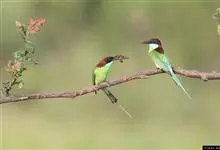 绿喉蜂虎是佛法僧目、蜂虎科的小型鸟类,共有9个亚种。身长22-25厘米,翼展29-30厘米,体重15-20克。喉绿色,额部、头顶至上背为锈红色,其余上体均为亮绿色。中央尾羽延长且端段狭细,…全部>>