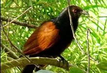 褐翅鸦鹃,是鹃形目鸦鹃科鸦鹃属的鸟类。褐翅鸦鹃的身体为黑色;头颈和胸带蓝紫色金属光泽并具黑亮的羽干纹,下胸至腹部泛金属绿光泽;两翼和肩部为棕栗色,外侧飞羽具暗色羽端,尾羽闪铜绿色光泽;虹膜赤红色,…全部>>