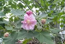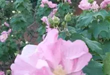 木芙蓉,锦葵科木槿属落叶灌木或小乔木。小枝上有细绒毛;叶片为卵状心形,托叶为披针形,常早落;花单生,花萼为钟形,花冠初为白色或淡红色,后逐渐变为深红色;果实为扁球形,有淡黄色的毛附着。花期8到10月。…全部>>