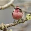 喜马拉雅白眉朱雀:小型鸟类,体长15-17厘米,体重24-35克。额基、眼先深红色,前额和一条长而宽阔的眉纹珠白色沾有粉红色并具丝娟光泽,在暗色的头部极为醒目。头顶至背棕褐或红褐色、具黑褐色羽干纹,…全部>>