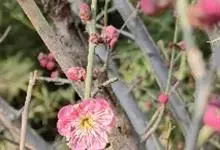 宫粉梅 Rehd.)是蔷薇科、李属植物,梅花品系中真梅系直枝梅类宫粉型,其花复瓣至重瓣,呈或深或浅的红色。落叶乔木,高达10米。树干褐紫色,有纵驳纹,小枝细而无毛,多为绿色。叶广卵形至卵形,…全部>>
