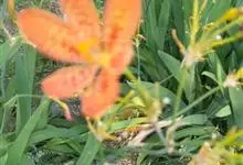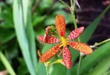 射干 Redouté)是鸢尾科射干属多年生草本植物。根状茎为不规则的块状,斜黄色或黄褐色;花橙红色,散生紫褐色的斑点;花药呈条形;子房下位,倒卵形;蒴果倒卵形或长椭圆形;种子圆球形,黑紫色,有光泽。…全部>>