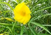 黄花夹竹桃K. Schum.),又名“酒杯花”“柳木子”“黄花状元竹”,是夹竹桃科,黄花夹竹桃属下的常绿乔木植物。高达5m,全株无毛,树皮棕褐色;叶互生,近革质,线形或线状披针形;花大,黄色,具香味,…全部>>