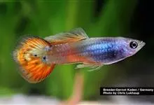 孔雀花鳉 ,俗名孔雀鱼,也称为凤尾鱼、彩虹花鳉、虹鳉、古比鱼等,是花鳉科花鳉属的一种热带鱼,雌雄鱼的体型和色彩差别较大,成年雄鱼身体瘦小,体长3-4厘米,体色绚烂多彩、体型优美;成年雌鱼体长5厘米…全部>>