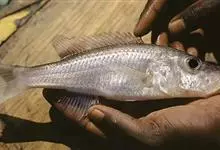 招财鱼,又名丝足鲈、战船鱼、点额丝足鲈,是鲈形目长丝鲈科丝足鲈属鱼类。招财鱼体呈银铜灰色,身上有深色直条纹,头尖,眼小靠前,口大。幼鱼体侧有8-10个黑色纵带;成鱼没有纵带或性别双色变异,两性褐色。…全部>>